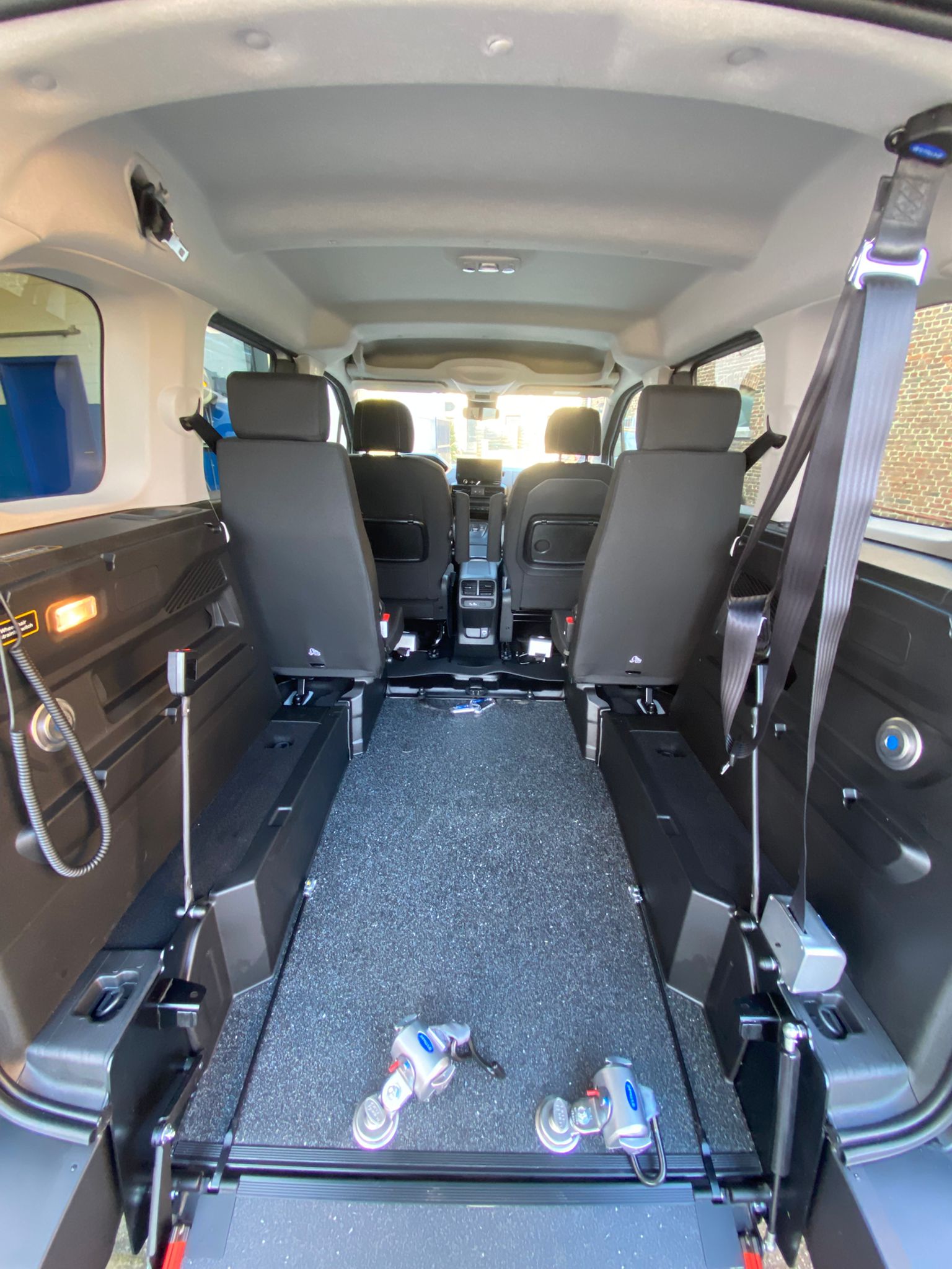 Le fauteuil roulant est sécurisé via 2 enrouleurs électriques à l’avant et 2 enrouleurs manuels à l’arrière, une ceinture 3 points assure la sécurité de la personne.