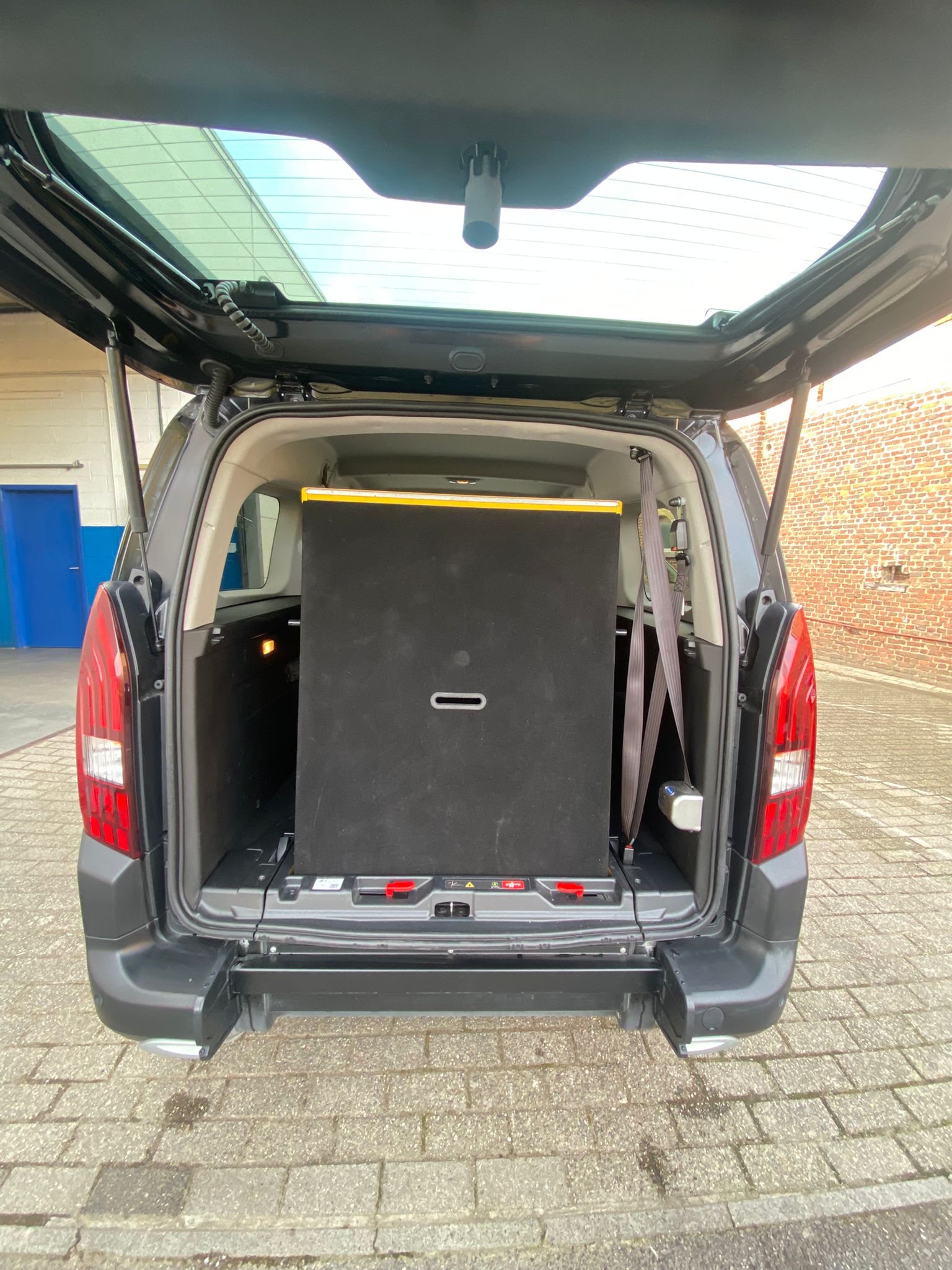 Nous vendons ce véhicule transformé pour le transport d’une personne en fauteuil roulant. En l’absence de la personne à transporter, la rampe se rabat à l’intérieur du véhicule de façon à conserver une surface de chargement classique.